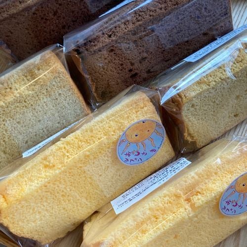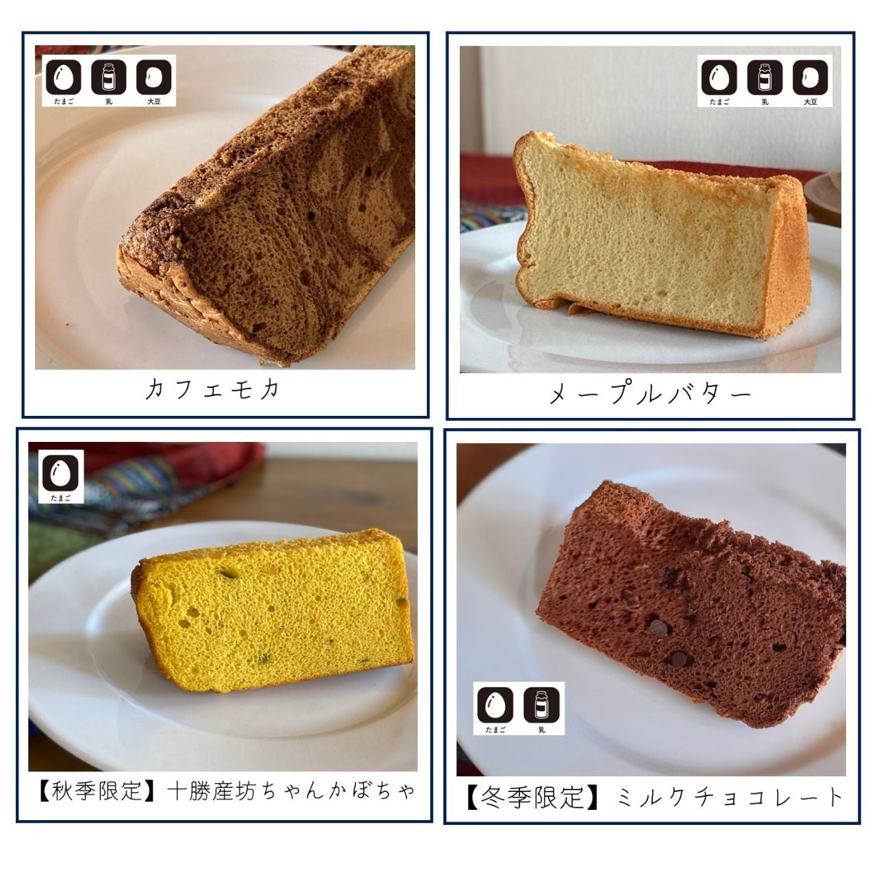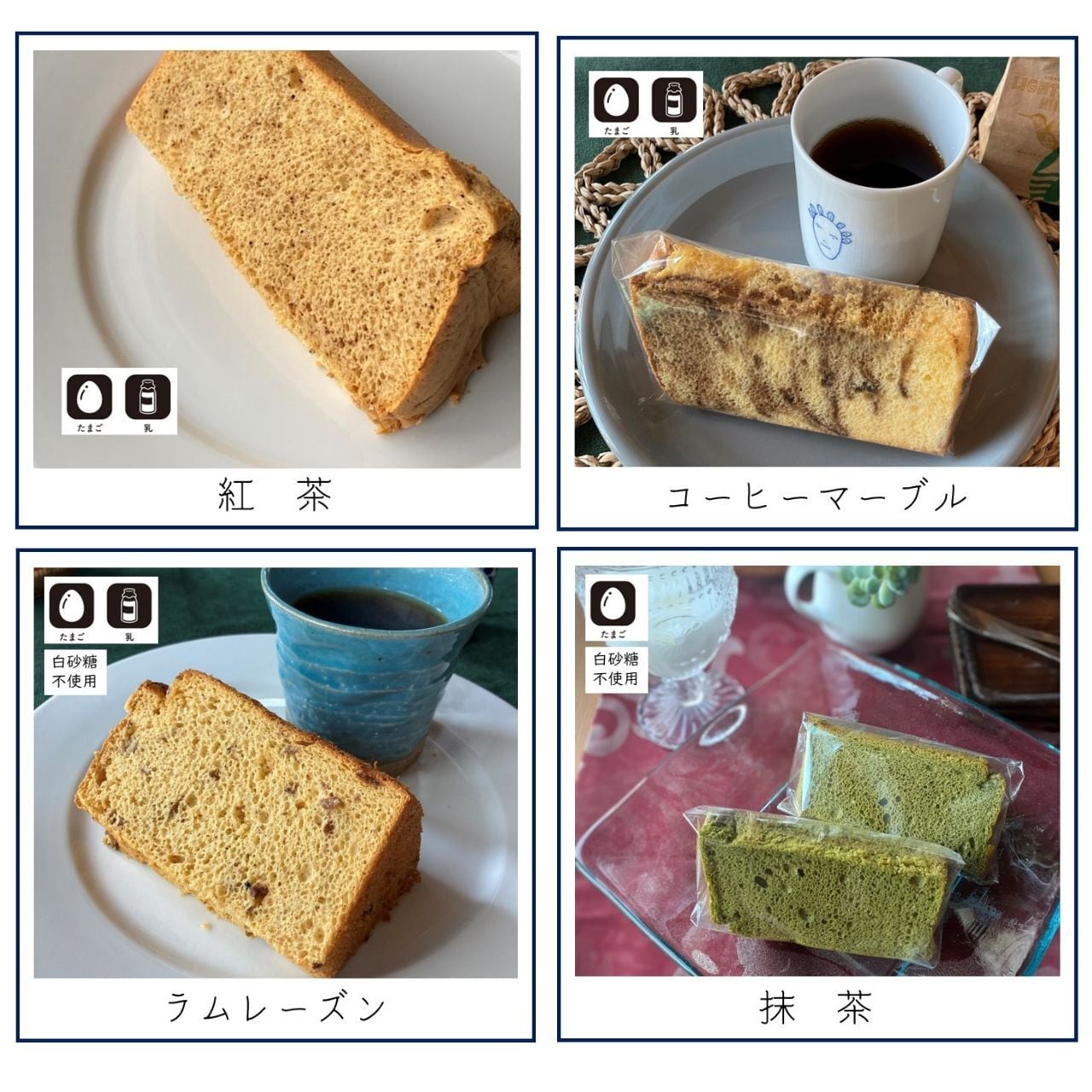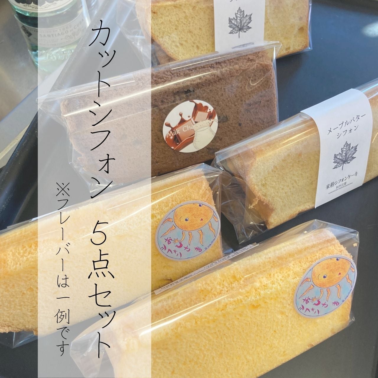 看板プレーン「おひさまシフォン」と、日替りの2種から、5点をセットにして、製造当日に発送いたします。(【抹茶】と【素焚糖プレーン】はミニサイズ2個が1点となります)