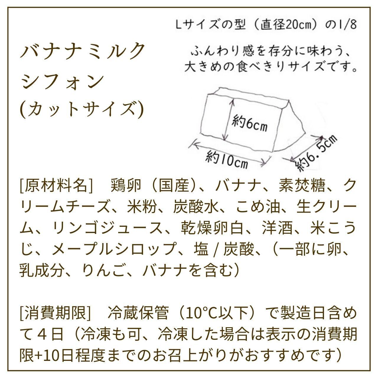 [原材料名] 鶏卵(国産)、バナナ、素焚糖、クリームチーズ、米粉、炭酸水、こめ油、生クリーム、リンゴジュース、乾燥卵白、洋酒、米こうじ、メープルシロップ、塩 / 炭酸、(一部に卵、乳成分、りんご、バナナを含む)