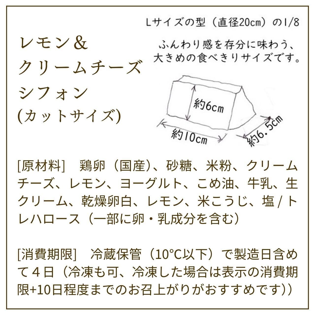 爽やかで濃厚な黄色のレモンの生地と、塩麹のまあるい塩味が効いたクリームチーズの白い生地。この2つをソフトクリームの「ミックス」のように重ね合わせて焼き上げました。お召し上がりのあともしばらくレモンの爽やかさが残る、幸せ感いっぱいのシフォンです。